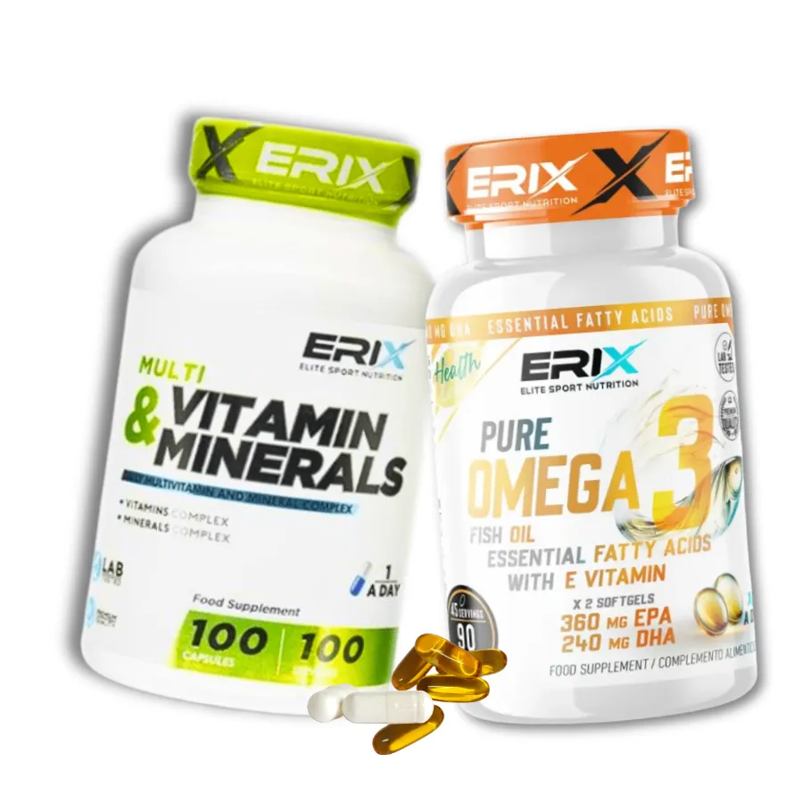Este Pack Salud Integral es un dúo pensado para mantener tu cuerpo en equilibrio día a día. Combina los beneficios de los ácidos grasos Omega-3, esenciales para la salud del corazón y cerebro, con un complejo completo de vitaminas y minerales, que ayuda a reforzar las defensas, apoyar el metabolismo energético y contribuir al bienestar general.