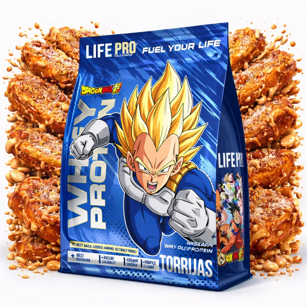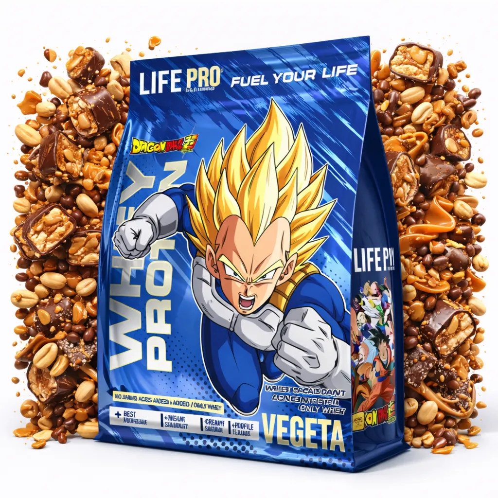 Soy Whey Protein Dragon Ball, edición especial inspirada en Vegeta. Vegeta es nuestro símbolo: El diseño no es solo una estética. Es un símbolo. Vegeta representa disciplina, superación y orgullo. Y eso mismo es lo que intento transmitirte en cada toma.
